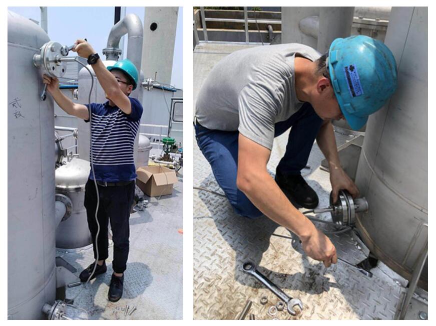 江蘇吳江的某大型污水處理廠是此次米科江蘇辦事處李工上門服務的地方。時值端午,工廠基本也都停止了工作,但是污水處理蒸發器的罐子前面卻聚集了好幾位技術人員。