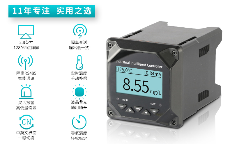 4、可進(jìn)行DO/SAT/OPP的測量、溫度測量、上下限控制、變送輸出、RS485通訊