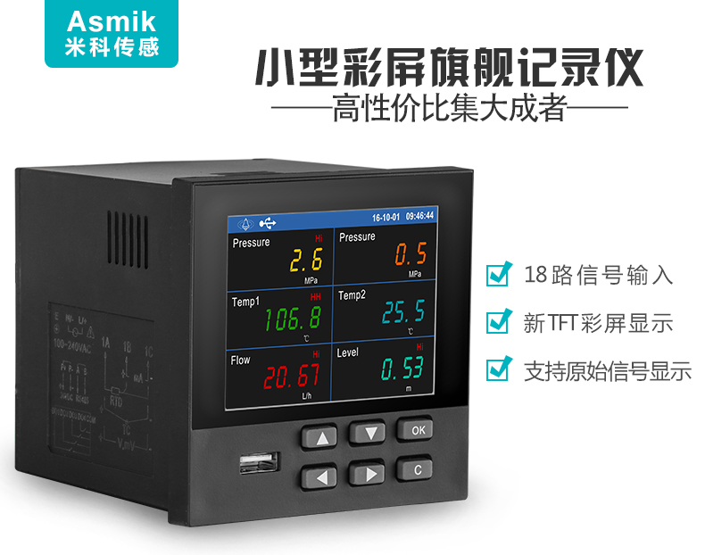 適用場合:米科MIK-R6000F新款無紙記錄儀1~36通道,集數據的測量、顯示、處理、運算、報警、記錄報表等多種功能于一身。可采集直流電壓、電流、熱電偶、熱電阻等常規數值的的采集與記錄。