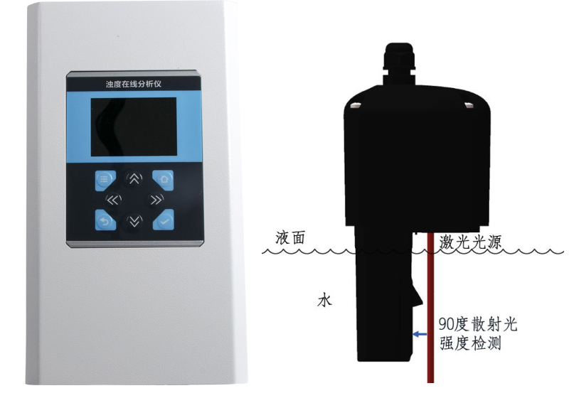 濁度在線分析儀是針對飲用水水質在線監測,量身研發的具有自主知識產權的專利產品,具有超低濁度檢出限、高精度測量、設備長時間免維護、省水工作和數字化輸出的特點,支持RS485-modbus通訊,可廣泛應用于自來水出廠水、二次供水、管網末梢水、直飲水、膜過濾水、游泳池、地表水等濁度在線監測。 原理:濁度在線分析儀將一束激光,從空氣中,按垂直于水面的方向,射入水中。激光被水中的懸浮顆粒散射,水中的傳感器檢測出與入射光成90 度方向的散射光強度,并根據校準表,將散射光強度換成成為濁度值。